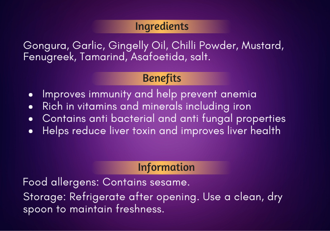 Gongura is known for its rich Vitamin C content, antioxidant properties, and its ability to aid digestion. It is also believed to help regulate blood pressure and cholesterol levels, making it a healthy and flavorful component of your diet.