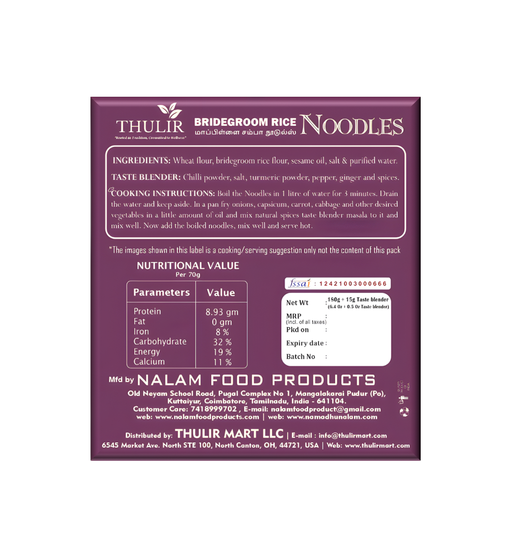 Mapillai Samba Rice Noodles bring you the traditional goodness of the ancient Mapillai Samba rice in a modern, tasty form. Made from the nutrient-dense red rice variety known for its strength-building and energizing properties, these noodles are rich in iron, fiber, and antioxidants. They help improve stamina, support digestion, and promote overall vitality. Naturally gluten-free and easy to digest, Mapillai Samba Noodles make a wholesome alternative to regular noodles—perfect for a quick, hearty, and healthy meal. Enjoy them stir-fried or with your favorite sauce for a truly nutritious and satisfying experience!