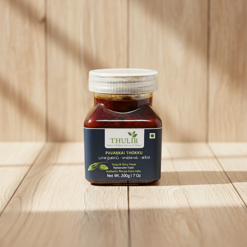 Pavakkai Thokku is a delicious and nutritious condiment made from Pavakkai (பாகற்காய்), also known as bitter gourd, blended with traditional spices for a perfect balance of taste and health benefits. This thokku is carefully prepared to retain the natural goodness of bitter gourd while enhancing its flavor with a mildly tangy and spicy twist.