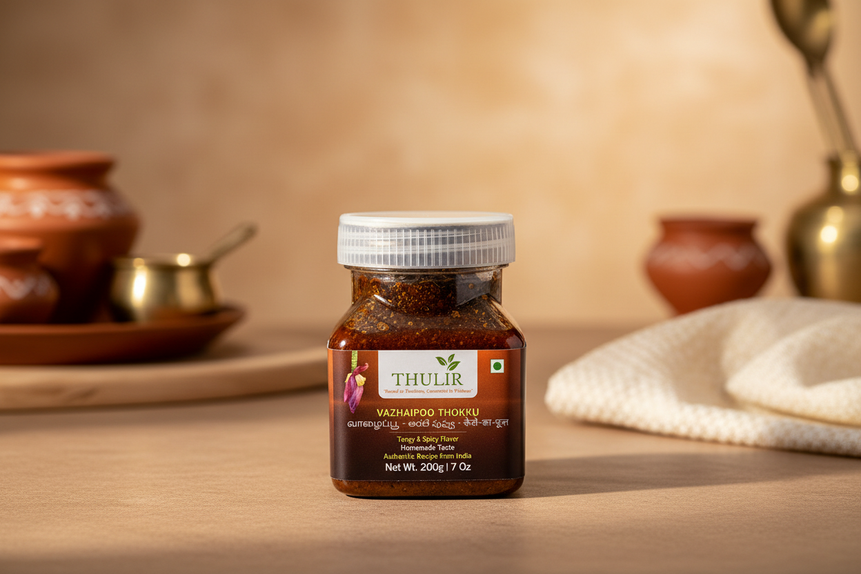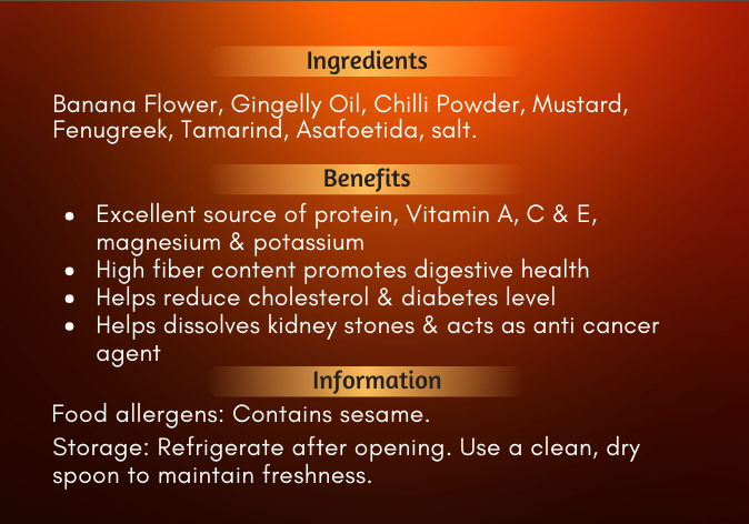 Vazhai Poo Thokku (வாழைப்பூ தொக்கு) is a delicious and nutrient-rich condiment made from banana flower, a traditional superfood known for its incredible health benefits. Carefully cooked with aromatic spices, tangy tamarind, and a hint of natural sweetness, this thokku adds a burst of flavor to your meals.